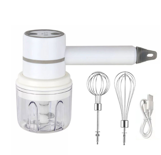 O Mini Batedor 3 em 1 funciona com apenas um clique. Versátil, é mixer, processador e batedor de massas leves, trocando apenas o acessório.